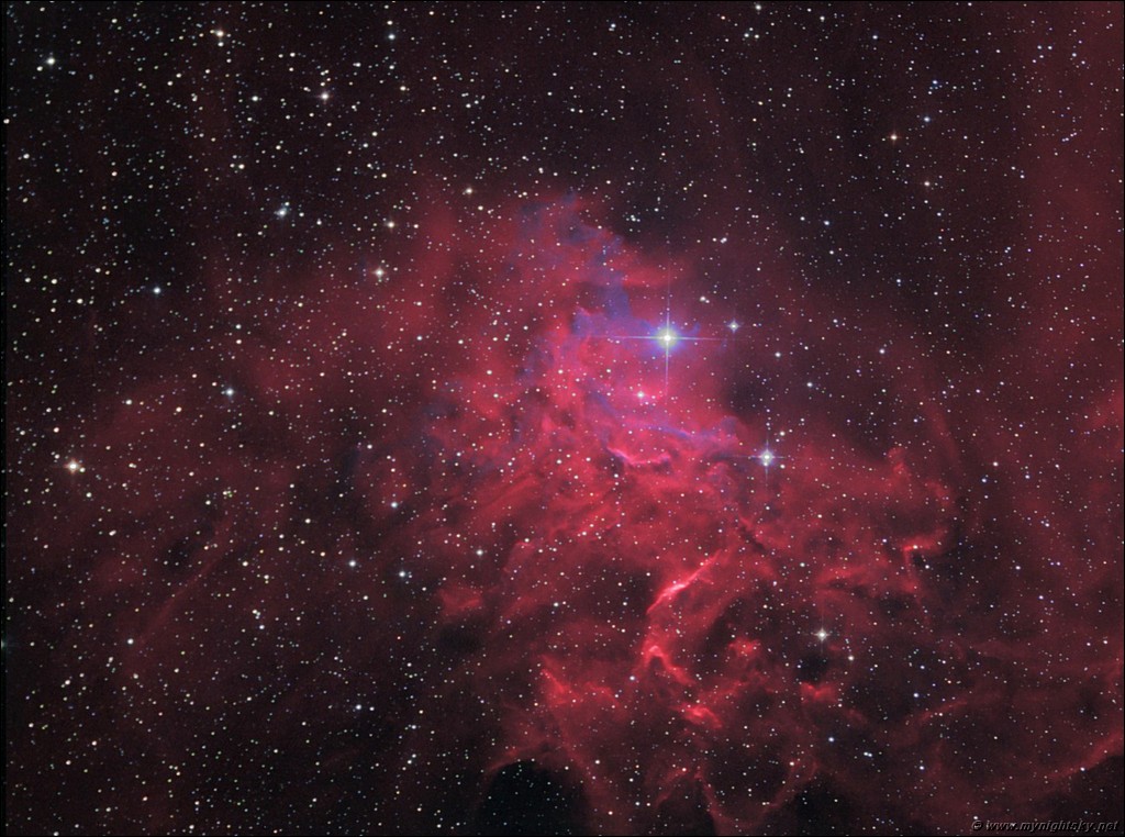 IC 405 / Flaming Star Nebula is an Emission/Reflection Nebula in the constellation Auriga, surrounding the bluish star AE Aurigae. It surrounds the irregular variable star AE Aurigae and is located near the emission nebula IC 410. The nebula measures approximately 37.0' x 19.0', and lies about 1,500 light-years away. It’s believed that the proper motion of the central star can be traced back to the Orion's Belt area. The nebula is about 5 light-years across. . . |
