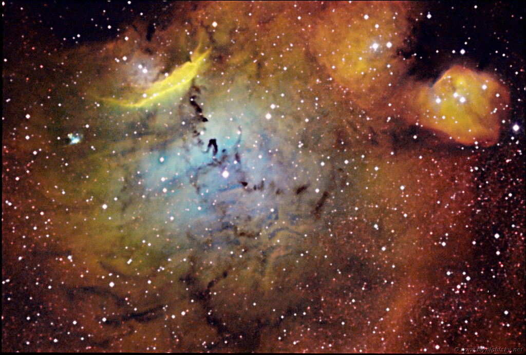 Hubble Palette SHO, Sll=R, Ha=G, Olll=B, 6ea. @ 15min. (Ha bin 1x1, Sll, Olll, bin 2x2) |