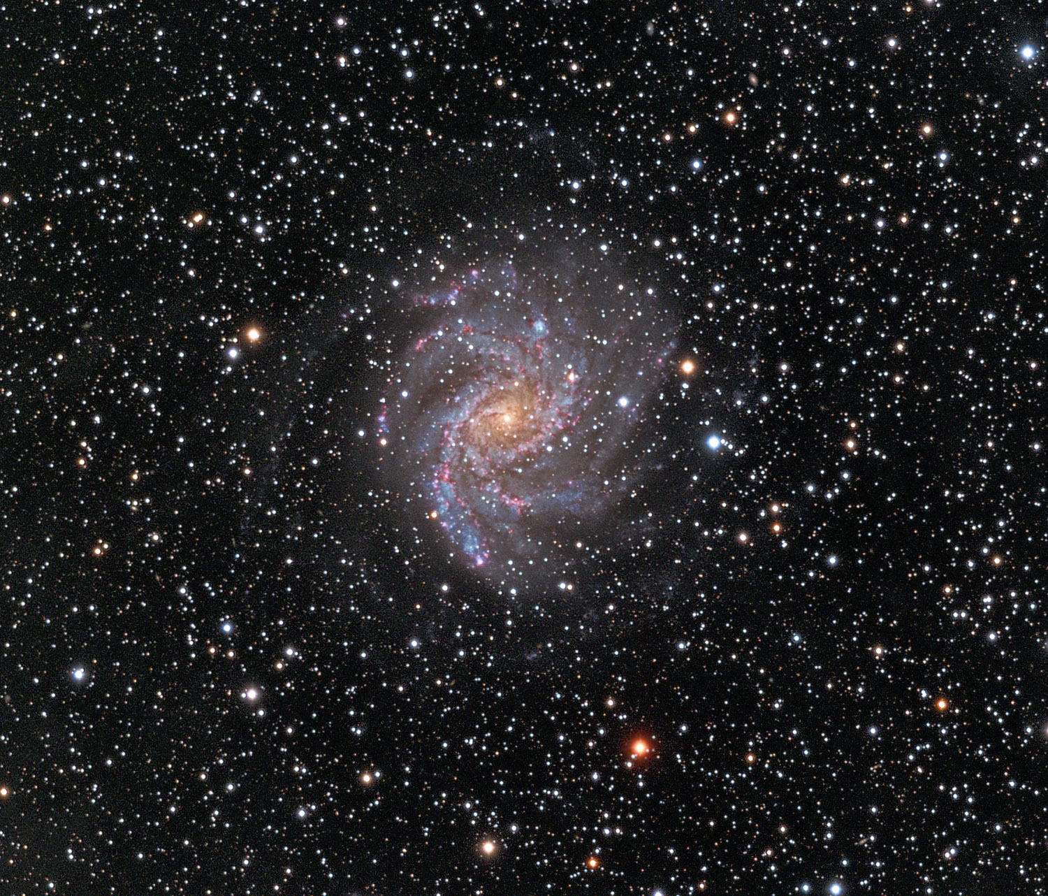 NGC 6946, (also known as the Fireworks Galaxy, Arp 29, and Caldwell 12), is an intermediate spiral galaxy about 22.5 million light-yearsaway in the constellations Cepheus and Cygnus. It was discovered by William Herschel on September 9, 1798. NGC 6946 is highly obscured by interstellar matter of the Milky Way galaxy, as it is quite close to the galactic plane. Nine supernovae (SN 1917A, SN 1939C, SN 1948B, SN 1968D, SN 1969P, SN 1980K, SN 2002hh, SN 2004et, and SN 2008S) in the last 60 years or so, have been observed in NGC 6946. . .