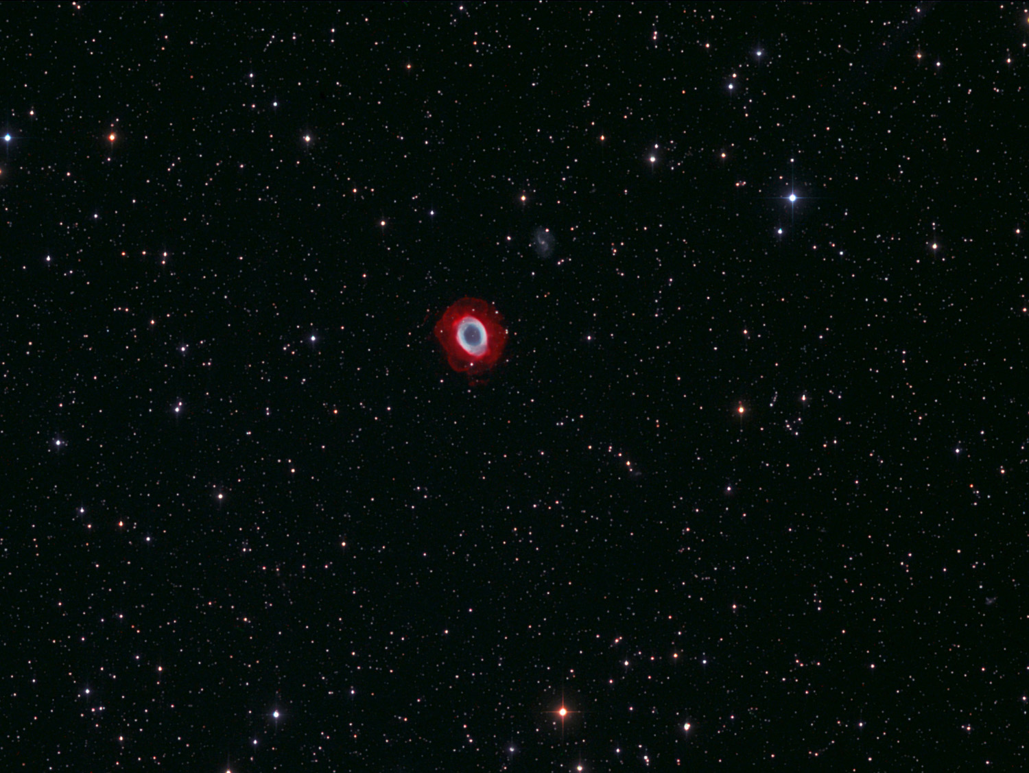 The Ring Nebula, M57 or NGC 6720 is a planetary nebula in the northern constellation of Lyra. Such objects are formed when a shell of ionized gas is expelled into the surrounding interstellar medium by a red giant star, which was passing through the last stage in its evolution before becoming a white dwarf.