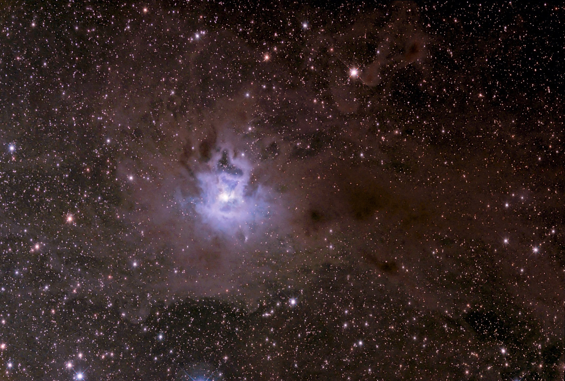 The Iris Nebula, also NGC 7023 and Caldwell 4, is a bright reflection nebula and Caldwell object in the constellation Cepheus. NGC 7023 is actually the cluster within the nebula, LBN 487, and the nebula is lit by a magnitude +7 star, SAO 19158. It shines at magnitude +6.8. It is located near the Mira-type variable star T Cephei, and near the bright magnitude +3.23 variable star Beta Cephei (Alphirk). It lies 1,300 light-years away and is six light-years across. . .